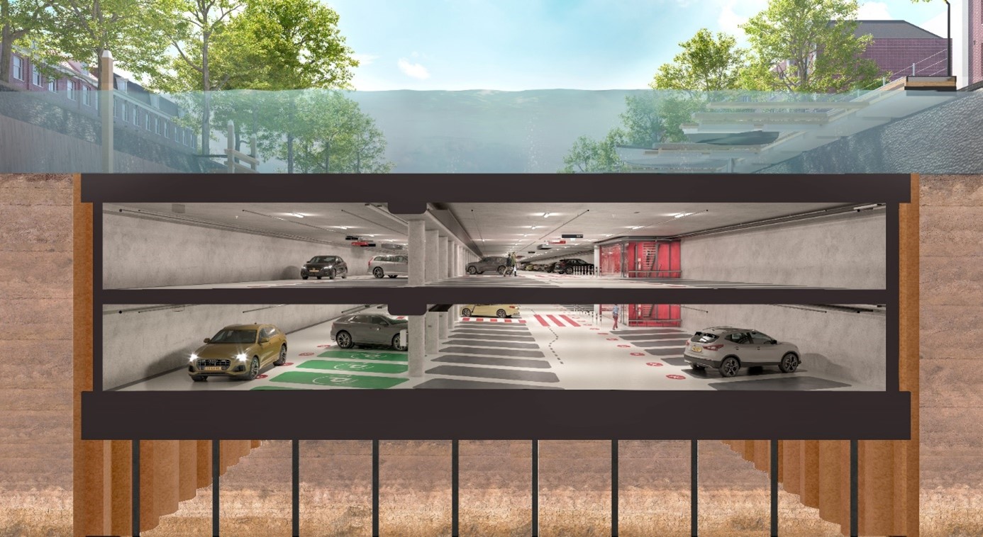 This car park has a total of 800 parking spaces. When it opens, at least 10% of the car park will be suitable for electric charging, with the option to easily expand this to 100%. As a result of the car park, current above-ground parking spaces will be moved underground, creating more space on the street. Space that will benefit green areas, pedestrians, children playing and cyclists.