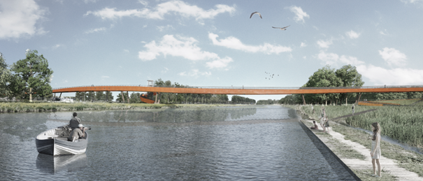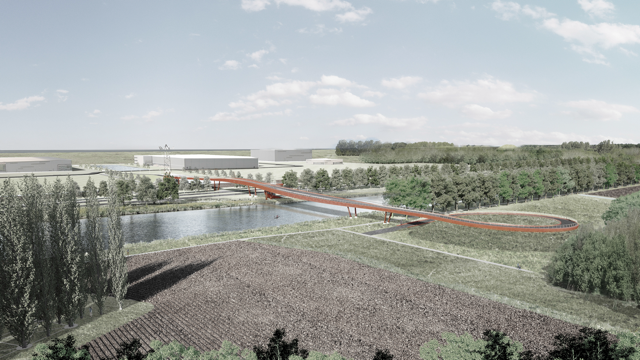 The Province of Flevoland has constructed a cycle and pedestrian bridge over the widened Waterlandseweg (N305) and the Hoge Vaart in Almere, near the Groene Kathedraal landscape artwork and the Stichtsekant business park.